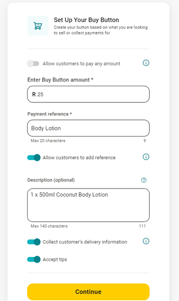 - On the Set Up Your Buy Button page, capture the required information and select “Continue”