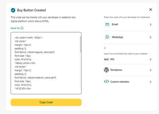 - Please note: if a buy button is edited, the code will have to be copied and embedded again, in order to see the changes