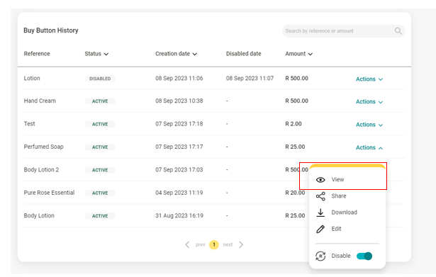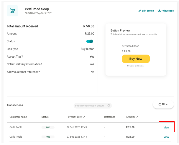 - Under Transactions, select "view" to open a detailed view of the Buy Button transaction