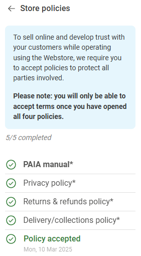 NOTE: These policies have been pre-configured to make it easy for you BUT please make yourself aware of the details before you publish your iK webstore.