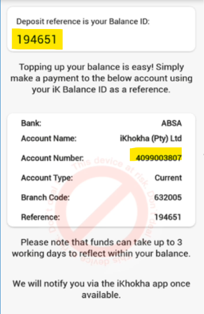 1️⃣ Enter the iKhokha account number provided. This can be found on the app or device Prepaid Balance - Top Ups