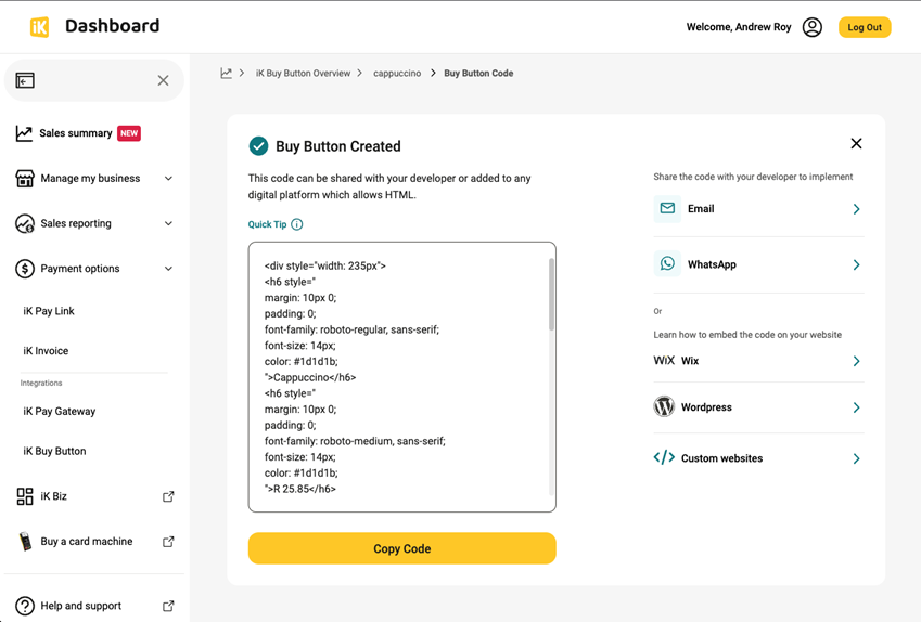 - Create your Buy Button within the iK Dashboard, and after generating it, retrieve the Buy Button code from the share page.