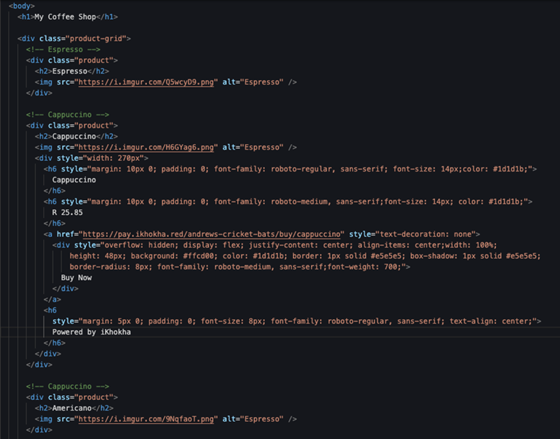- Paste the button code we copied from the dashboard (in Step 3) and paste it under the “Cappuccino” product. For example:
