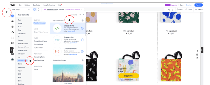 - Log into WIX (please note that your website needs to already be set up) and click on the + icon at the top left side.