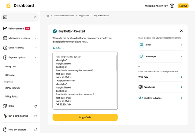 - Create your iK Buy Button within the iK Dashboard, and after generating it, retrieve the Buy Button code from the share page.