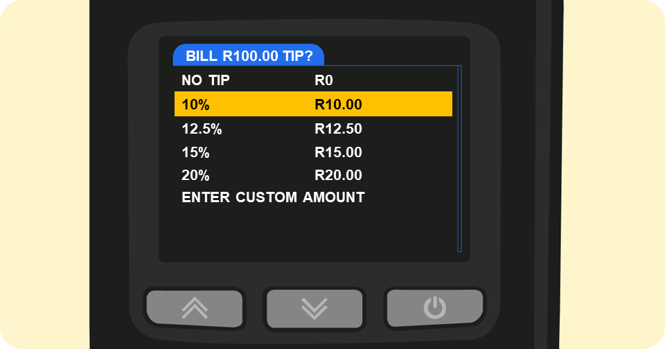 Step 3: Select or let the customer select the tip amount by using the up and down arrows to highlight the option and by pressing the green "enter" button to proceed.