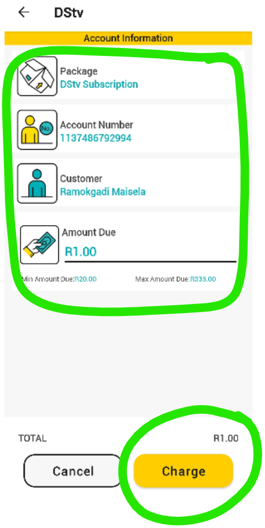 Step 5 - Confirm the account details, confirm the amount and select "Charge"