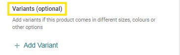 Step 1: When creating a product, one of the attribute options that can be configured is "variant". Click + Add Variant to set this up.