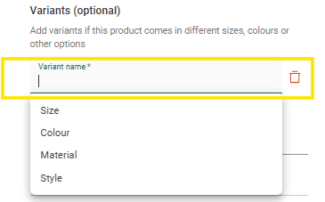 Step 2: Specify the variant name - (this can be anything that makes sense to help classify your product). A suggested list of typical variant names is provided for, but you can specify anything else by simply typing a new one.