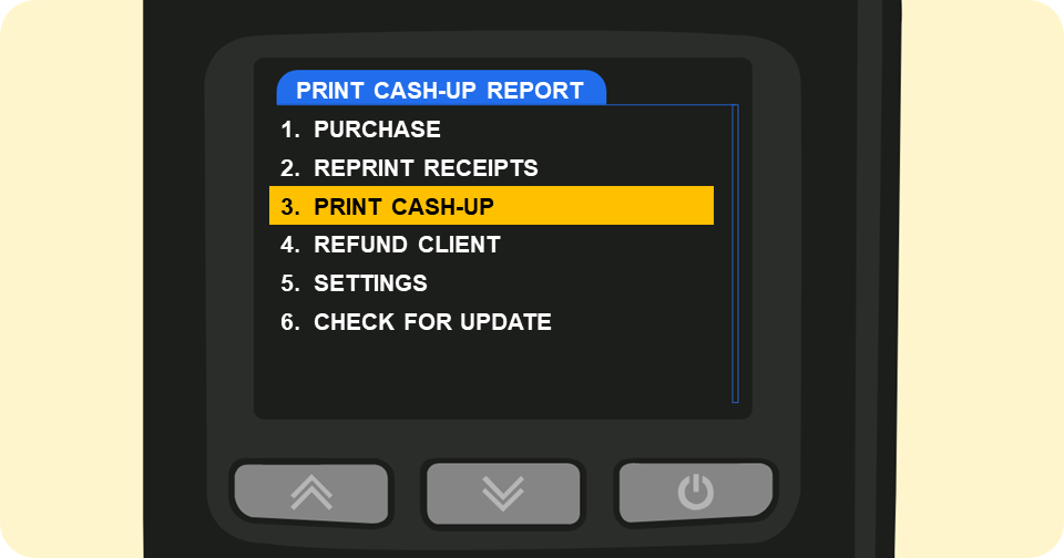 Step 2: Select "Print Cash-Up" using the down arrow, then press the green button.
